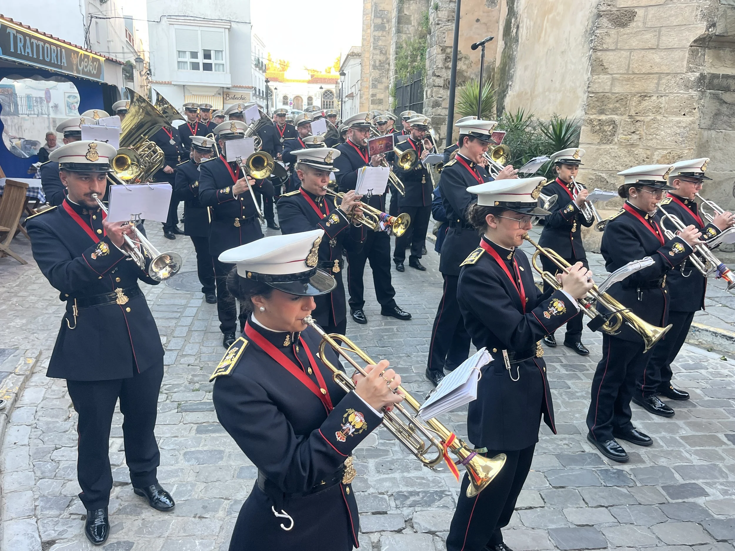 Tarifassa kadut oli suljettu ja pääsiäisen vietto juuri alkamassa, kun saavuimme kohteeseen. Kulkueet, joita oli eilen seurattu Malagassa, oli supistunut yhteen kulkueeseen, joka loi läheisydessään hienon tunnelman sen seuraamiseen. Ja totta kai, rummut löivät ja torvet soivat korvia huumavasti.