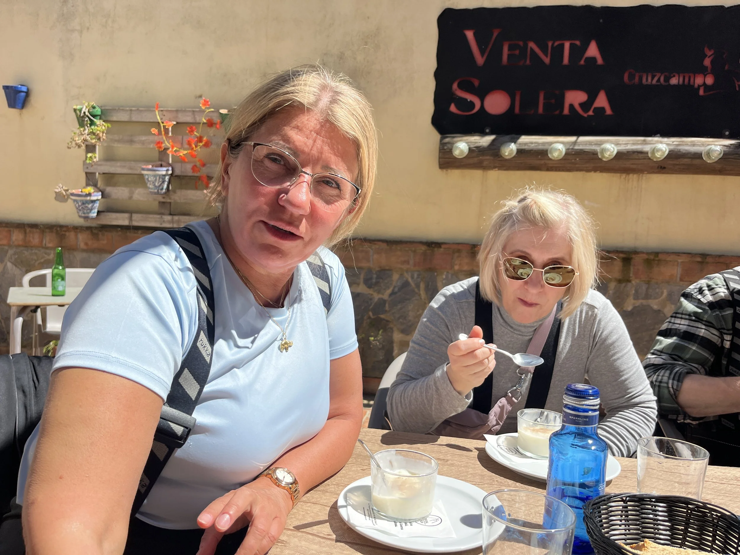 Lounas kodikkaan tienvarsiravintolan sisäpihalla, kaikille sama ateria, se jouduttaa ja rauhoittaa ruokailuhetkeä. Jaana ja Hilkka.