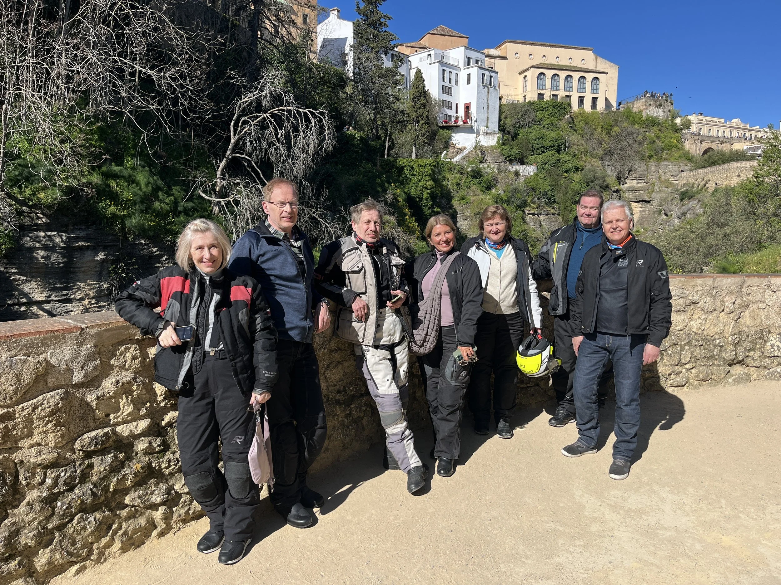 Perinteinen ryhmäkuva Rondan tunnetun Puenta Nova -sillan kupeessa. Hilkka, Tapani, Timo, Jaana, Tuuli, Antti ja Jokke.