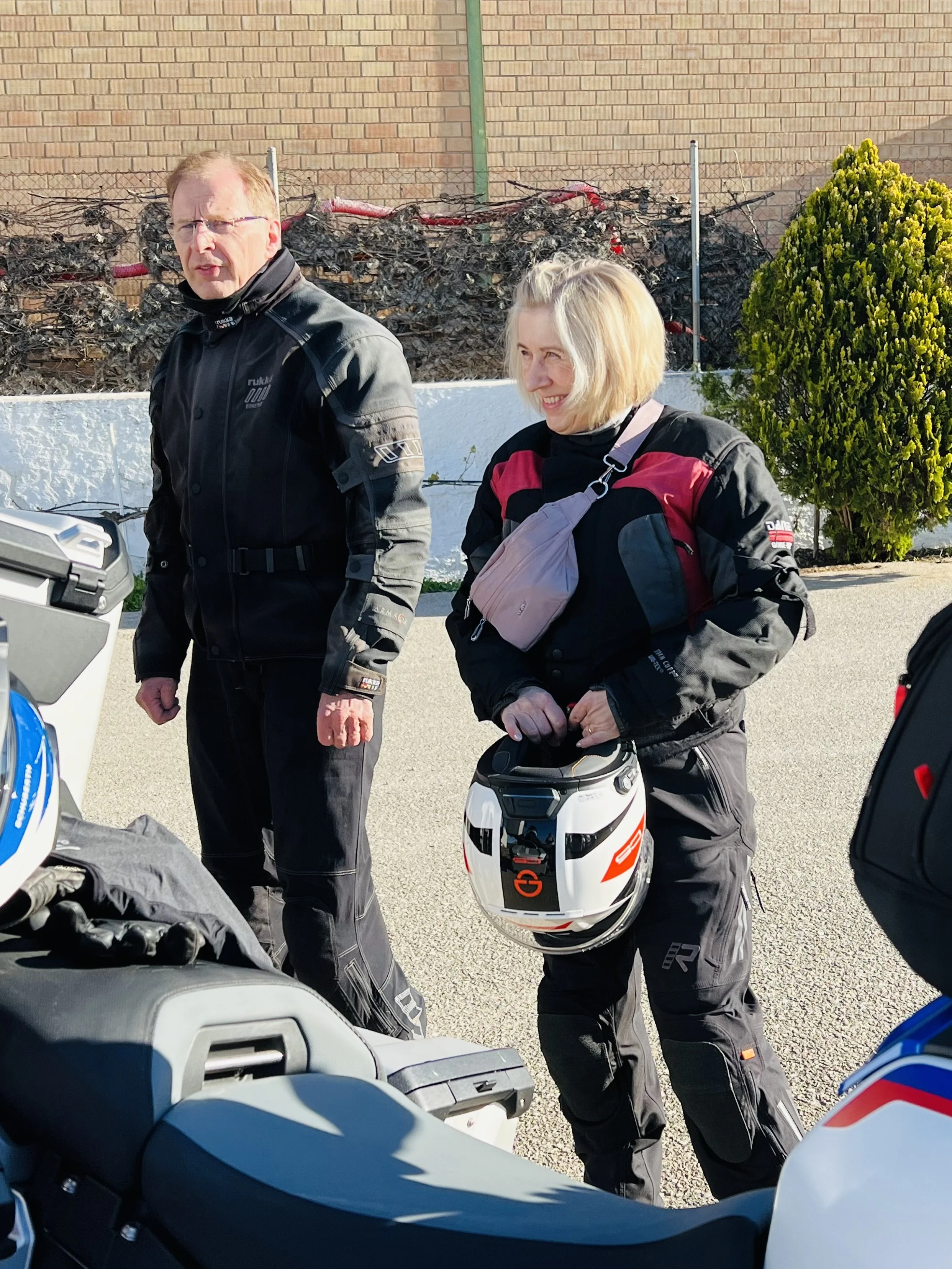 Hotellilta Normanin kyytiin nousivat Antti ja Tuuli, joiden BMW R 1300 GS odotteli Tebassa kuljettajaansa kyytiläiseneen. Muita autokyytiläisiä olivat Jouko ja Timo. Jokelle oli varattu BMW F 750 GS ja Timolle Honda Transalp 750. Autokyydin valitsivat myös Hilkka ja Jaana, koska aamun lähtölämpötila oli heille hieman turhan raikas, vain +12 C. Viisas valitsee autokyydin…