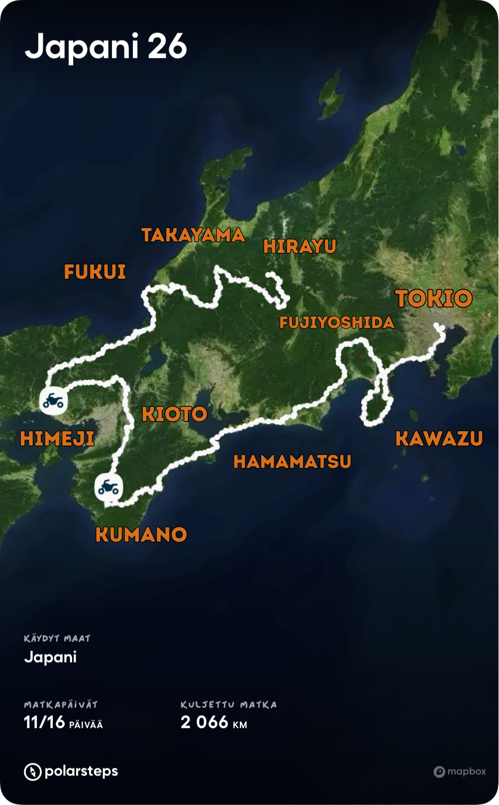 Toisaalta, jos sadepäivän piti osua kohdalle, niin tämä oli siihen aika hyvä paikka. Lyhintä reittiä seuraavaan kohteeseen, Hirayu Onsenin kuumien lähteiden kylään, oli vain noin 50 kilometriä.
