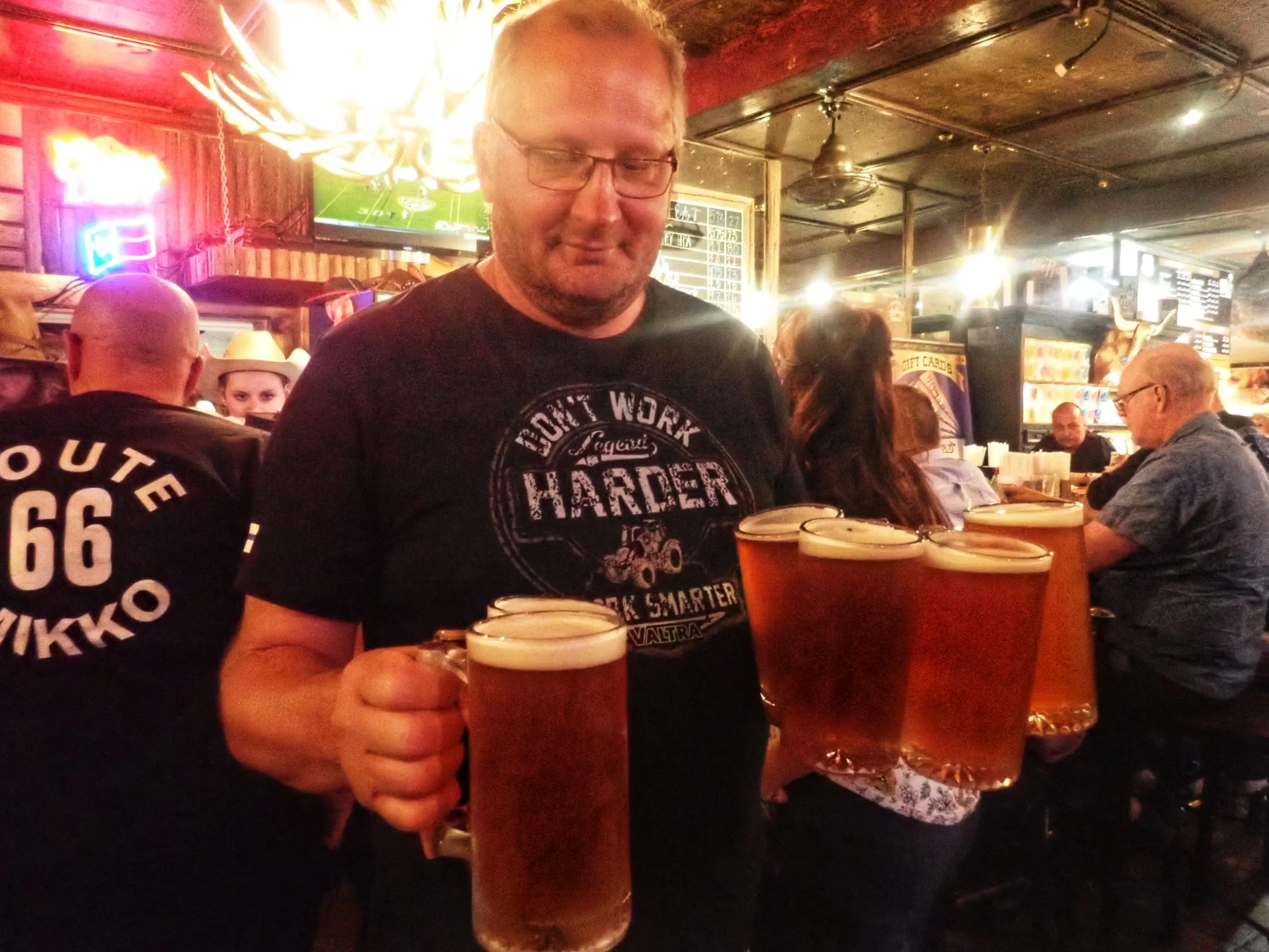 Amarilloon saavumme rutkasti ennen auringonlaskua väsyneinä, mutta onnelisina. Erittäin kuuma ja pitkä päivä takana. Kylmät kypäräkaljat Big Texan baarissa kuitenkin korjaavat kaiken väsymyksen pois! ;)
