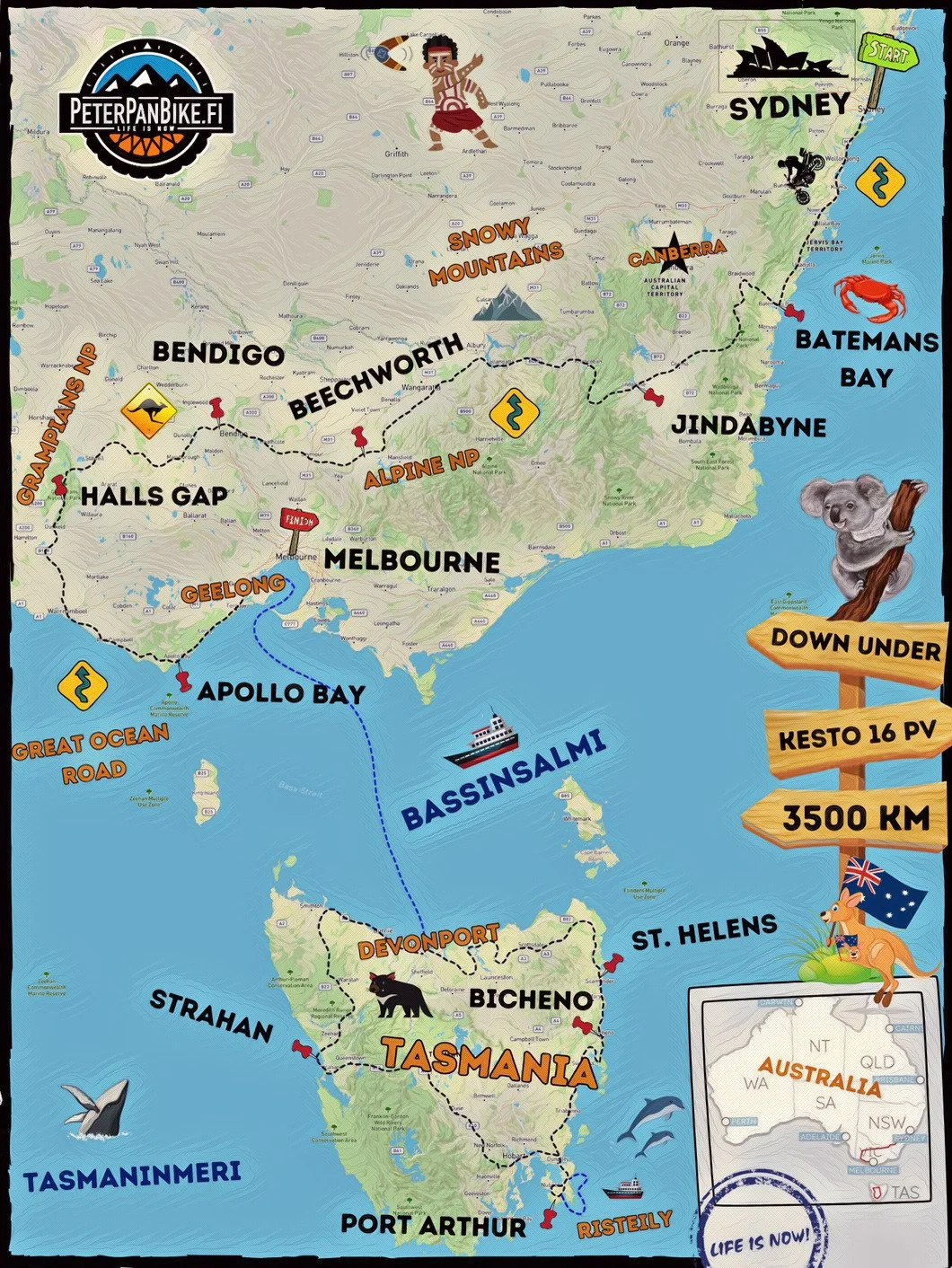 Aloitamme seikkailun ikonisen oopperatalon nurkilta Sydneyssä, päristelemme Snowy Mountainsien vuoristossa ja vierailemme lukuisissa kasallispuistoissa. Tutustumme myös Australian äärettömiin takamaihin ns. ”Outback” ja viinitiloihin. Keräämme käytännössä kaikki Australian parhaat mutkatiet, joita kruunaa motoristien Graalin malja, eli ”Great Ocean Road”, joka ajetaan päästä päähän. Väistelemme kenguruita, vompatteja ja koaloja niin mantereella, kuin Tasmanian saarella, johon seilaamme Bassinsalmen yli. Autenttinen saari säväyttää uniikilla luonnollaan, loputtomilla mutkilla ja mielenkiintoisella historialla.