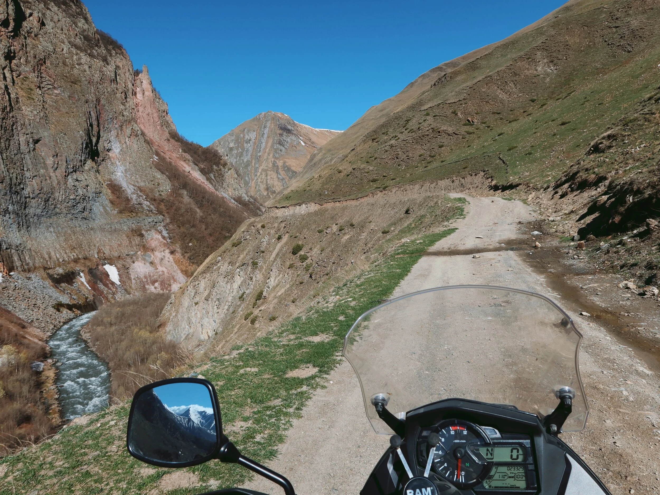 Iltapäivällä oli jo sen verran kuumaa, että päätettiin päräyttää takaisin korkeuksiin hieman viileämmän kelin toivossa. Ennen Gorin kaupunkia, joka toimii tänään myös yöpaikkana, kannataa poiketa Didgorin taistelumonumentilla, johon vie juuri äskettäin päällystetty mutkikas asfaltti!
