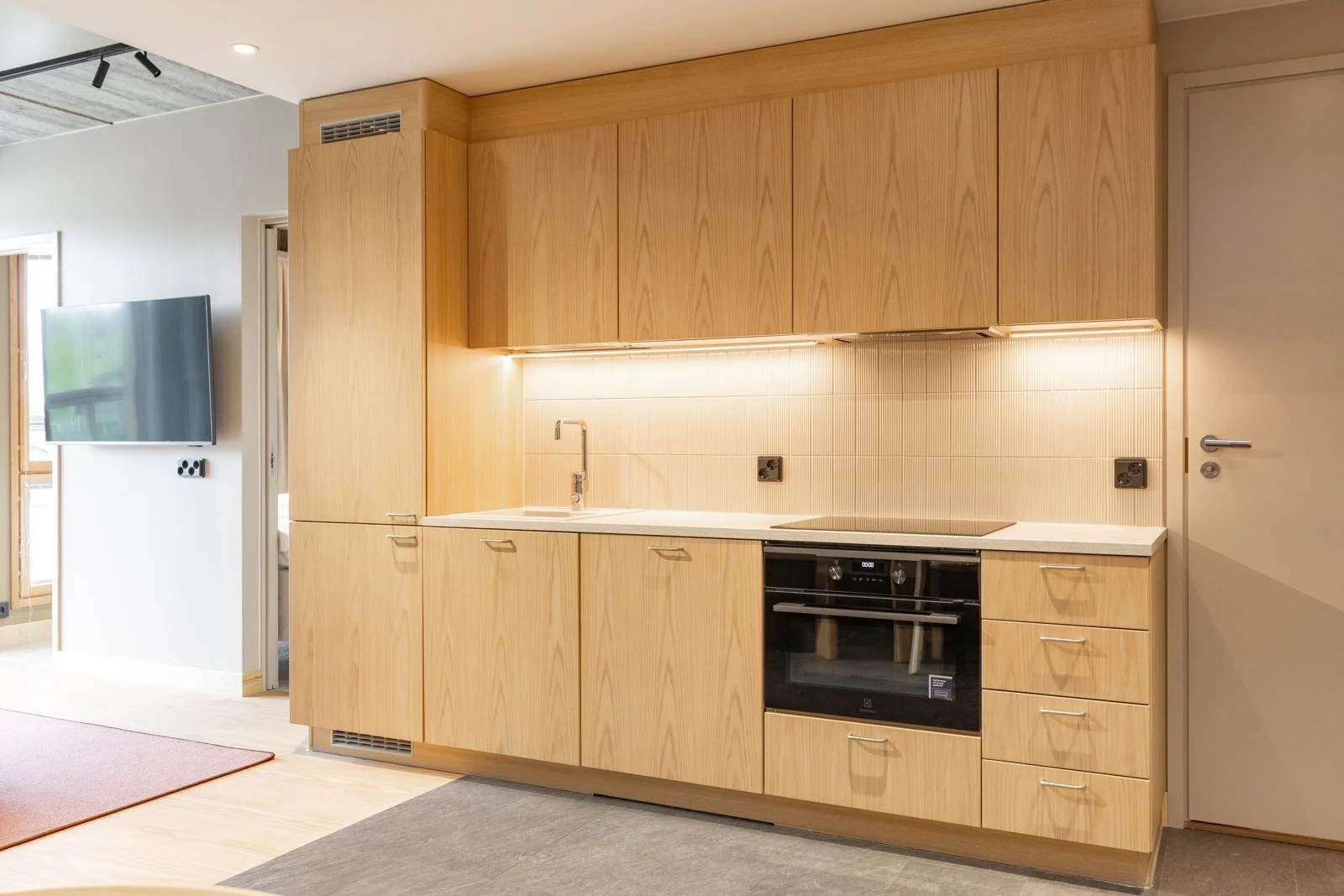 Hotellin jokaisessa huoneistossa on hyvin varusteltu keittiö, lasitettu parveke ja oma sauna.