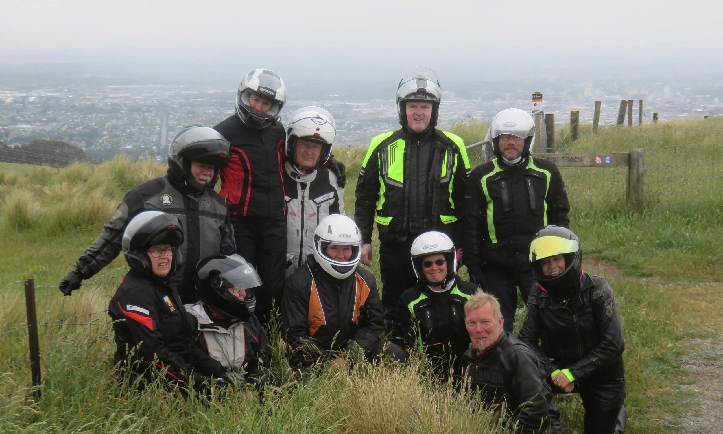 Hobitteja ruohikossa? Vasemmalta Teija, Herra Nisl Rinne, Reija, Wilma, Jukka, Riitta, Jorma, Chrisse, Kari, Kimmo ja Martine Christchurchin katolla!