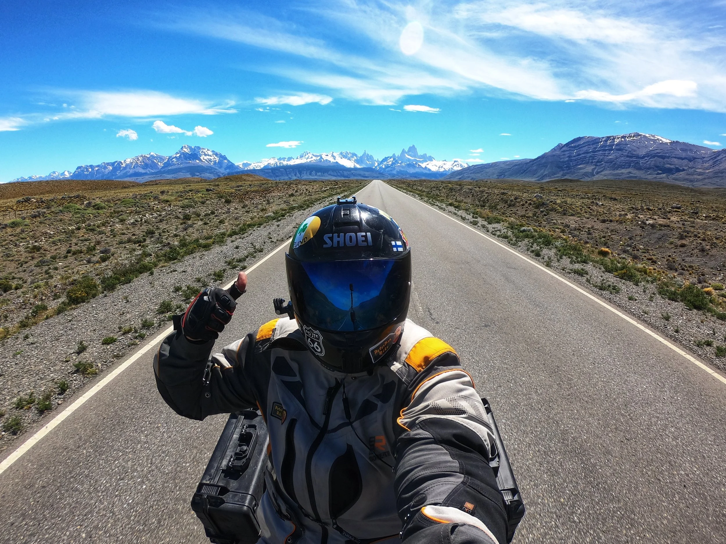 Tervetuloa Argentiinan pampaksille! Nämä ovat maailman syrjäisempiä seutuja - vähän bensa-asemia, liikennettä ja silmänkantamattomin luontoa. Allamme yksi maailman legendaarisimmista teistä Ruta 40, joka on pääsääntöisesti suora, mutta pitää varoa tien yli juoksevia laamoja.