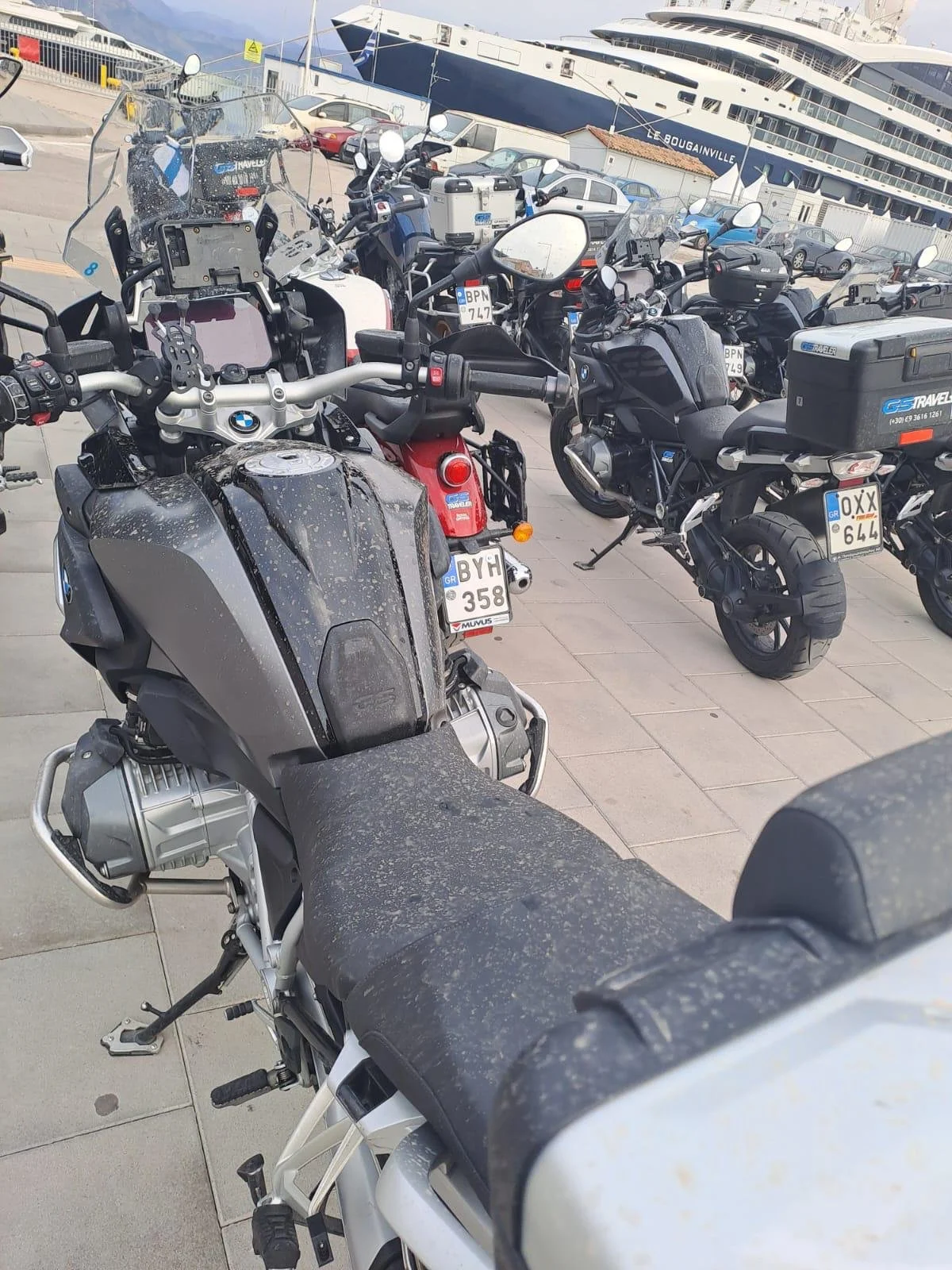Maanantaina otettiin, näille Kreikan reissuille, tyypillinen liikekannallepano. Lähtö oli sovittu aamiaisen jälkeen klo 9:30 ja se aikataulu piti. Yöllä oli satanut ja pyörät olivat aamulla päällystettynä Saharan hiekalla, joka laskeutuu sateen mukana alas ja peittää kaiken. Pyyhesulkeisten jälkeen pyörät näytti taas entisiltä ja päästiin matkaan.