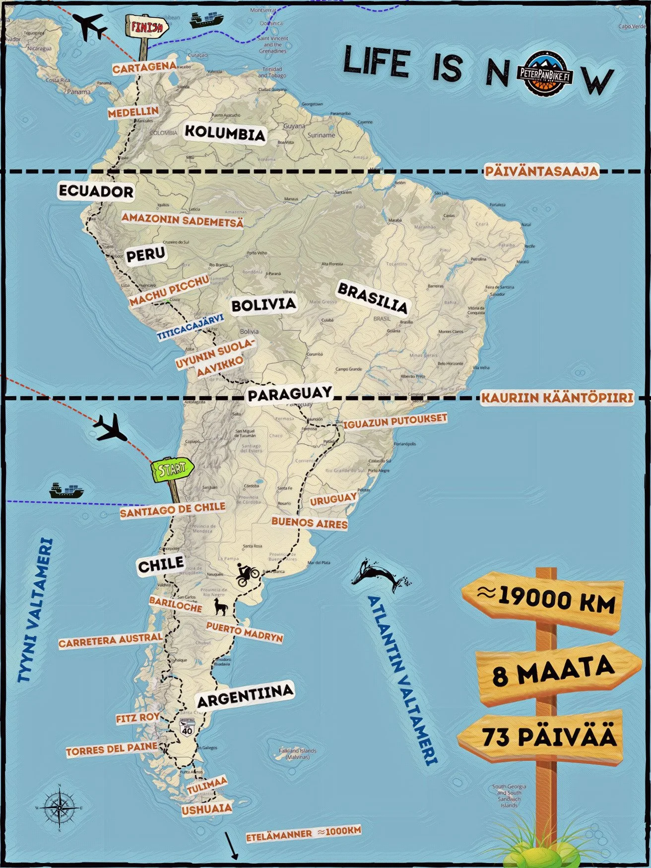 Mutta ota huomioon, että ajamme noin 19 000 kilometriä läpi kahdeksan eksoottisen Etelä-Amerikan maan 73 päivän aikana. Tällaiselle matkalle ei lähdetä hetken mielijohteesta – se vaatii oikeanlaista asennetta, halua astua ulos omalta mukavuusalueelta ja kykyä sietää epävarmuutta.