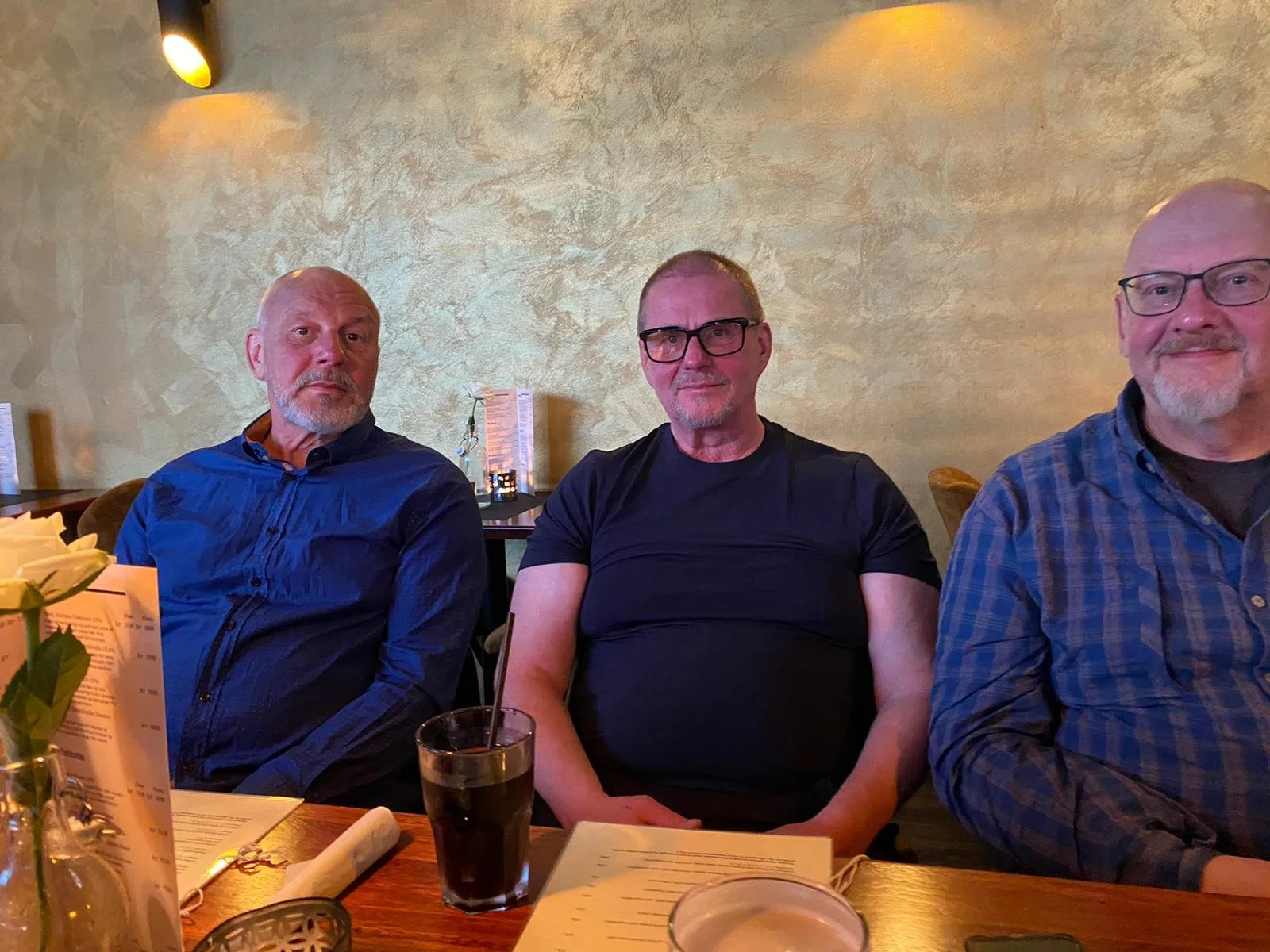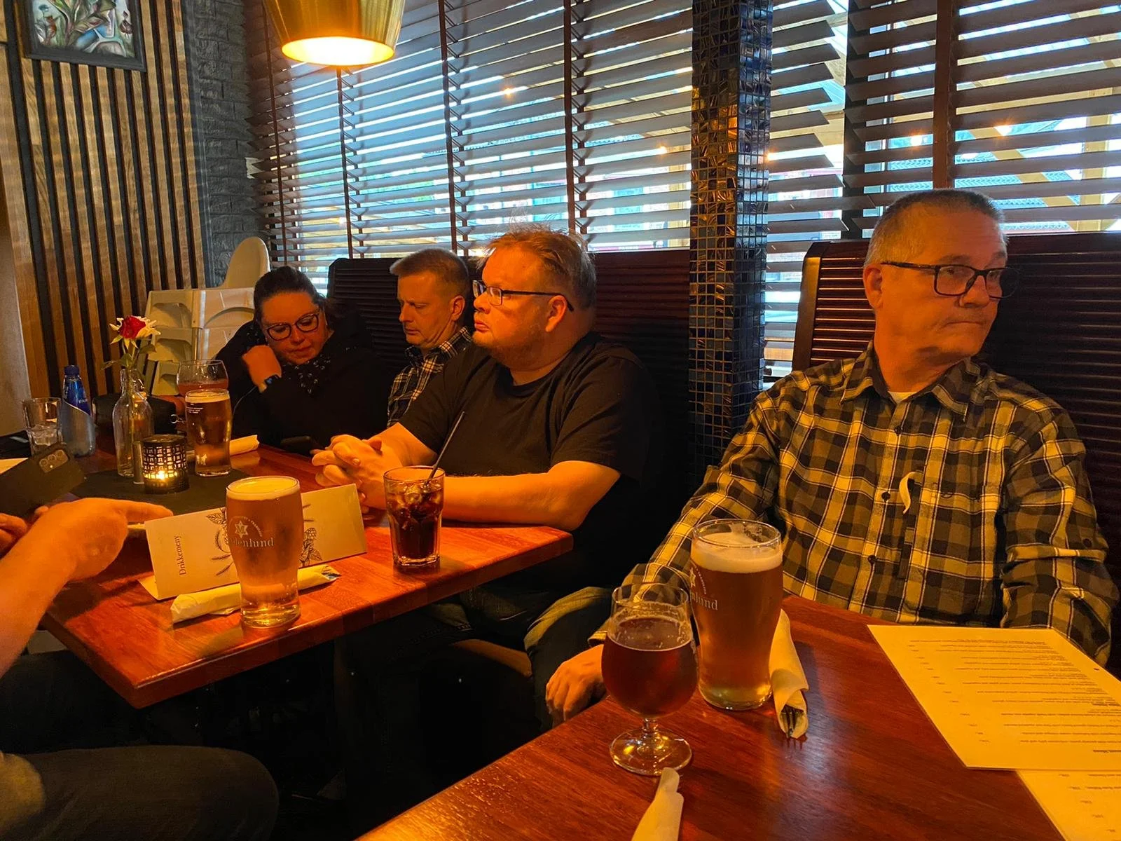 Maittavaan ajopäivään kuuluu tietysti maittava illallinen, eikä suun kostukkeeksi nautittu kylmä olutkaan pilaa tunnelmaa. Juha, Tiina ja OP.