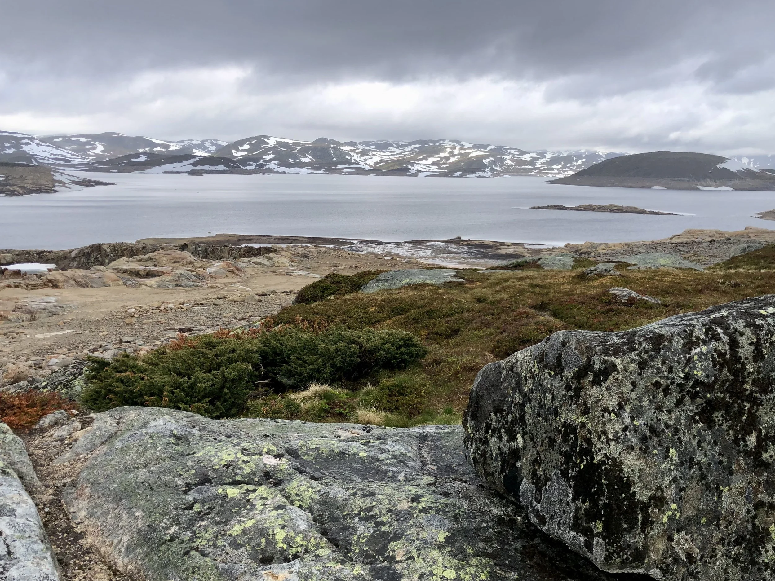 Dalenissa aamu-aurinko paistoi mukavasti, kun jatkoimme Skandit -vuoriston ylityksiä kohti Lysebotnia. Juuri kun kuin ensimmäinen ylänkö oli ylitetty, alkoi sade ja päästiin testaamaan viime kesältä käyttämättömänä ollutta sadevarustusta. Hyvin toimi ja tarpeeseen tuli, voidaan sanoa. Mistään loputtomasta sateesta ei kuitenkaan puhuttu, sillä päivä paistoi paikka paikoin ja muutaman kerran ihan mukavastikin. Totuuden nimissä ei kuitenkaan yritetä valkaista sadepäivää poutapäiväksikään.