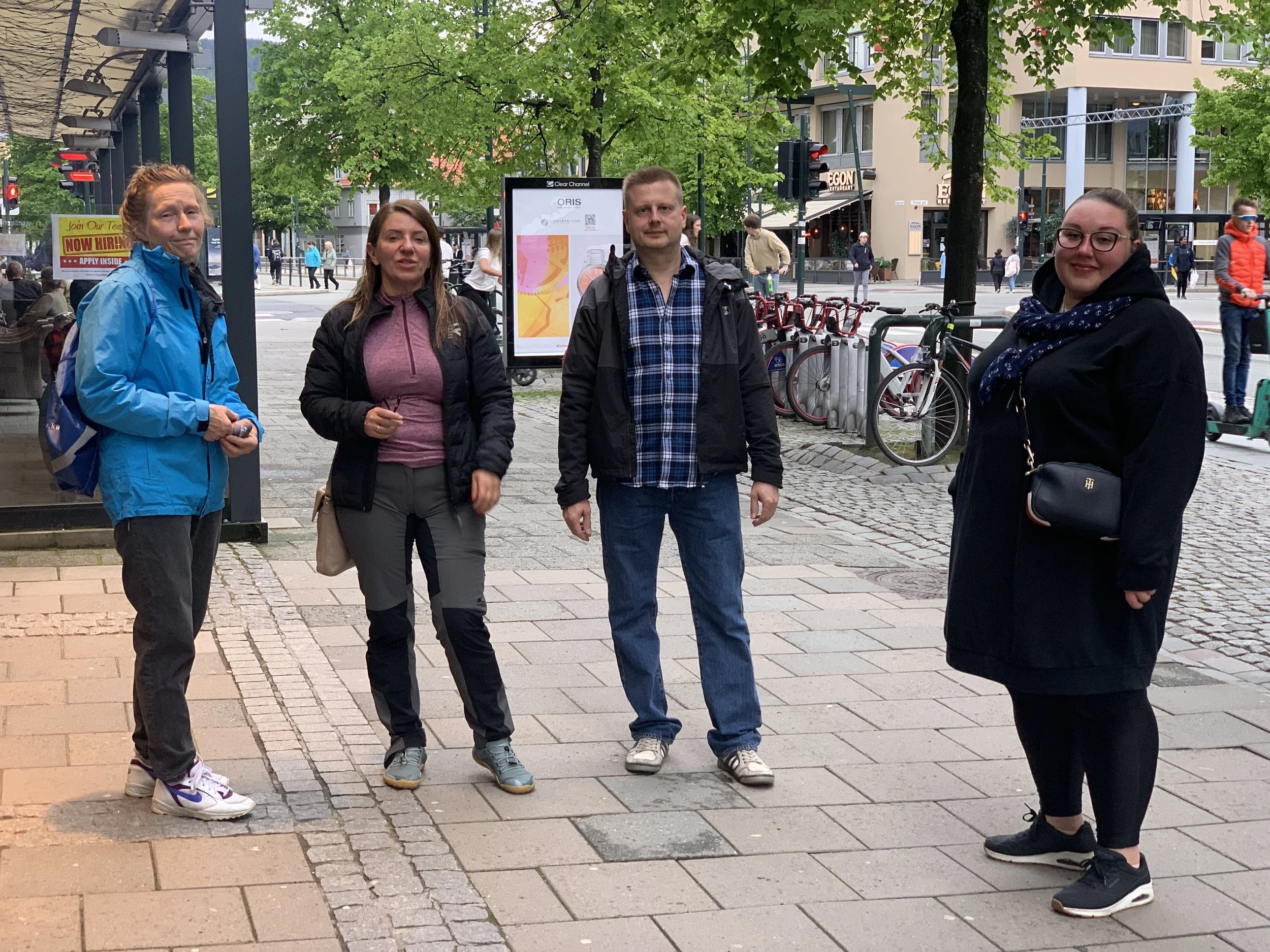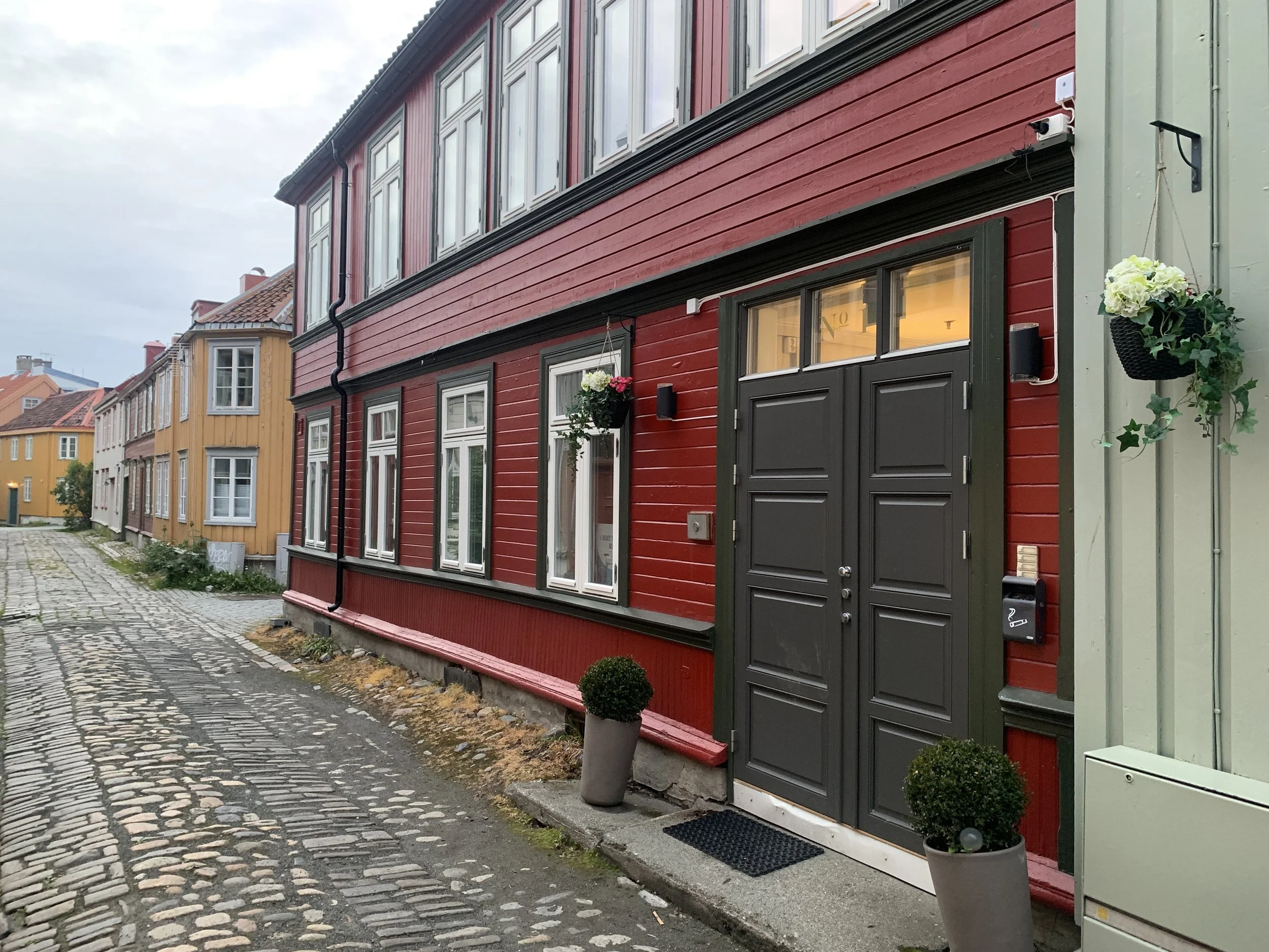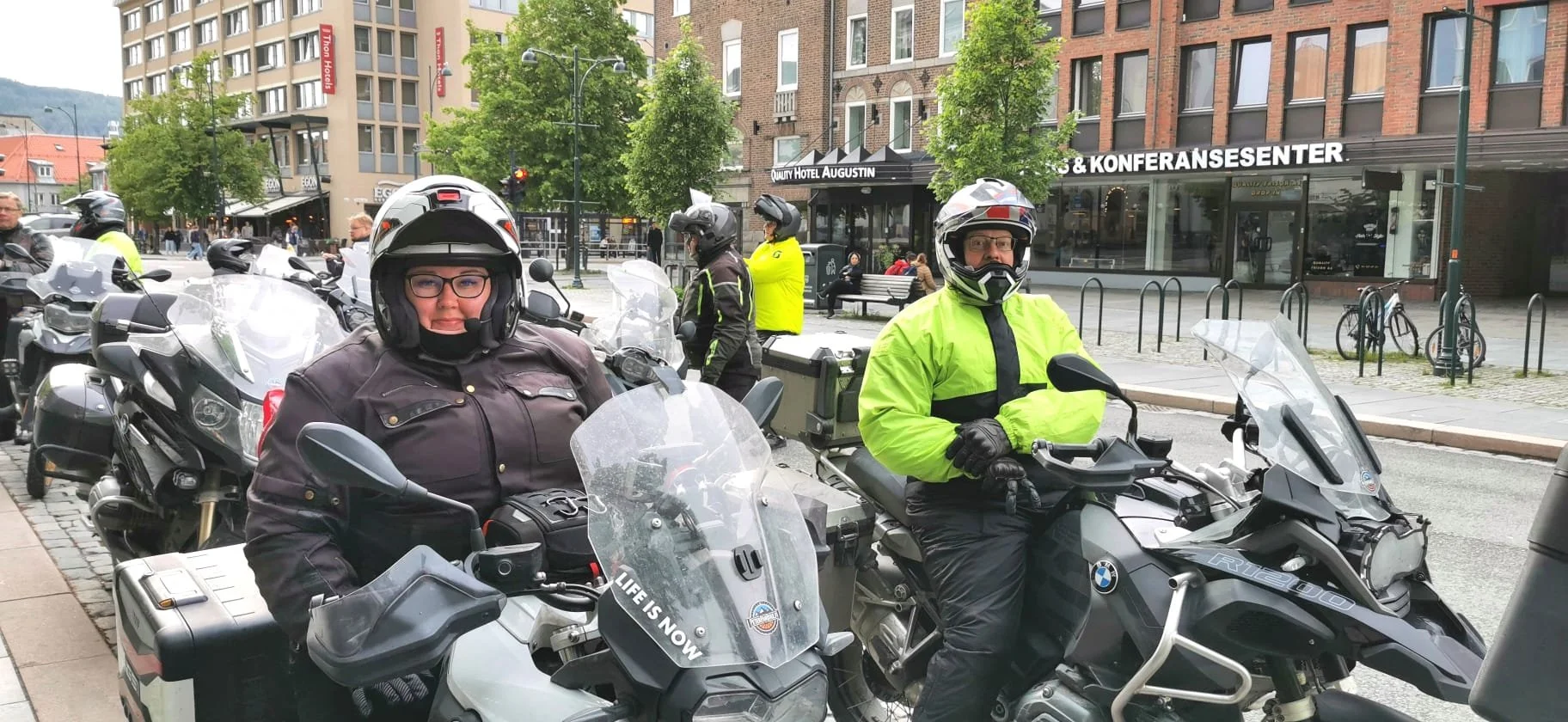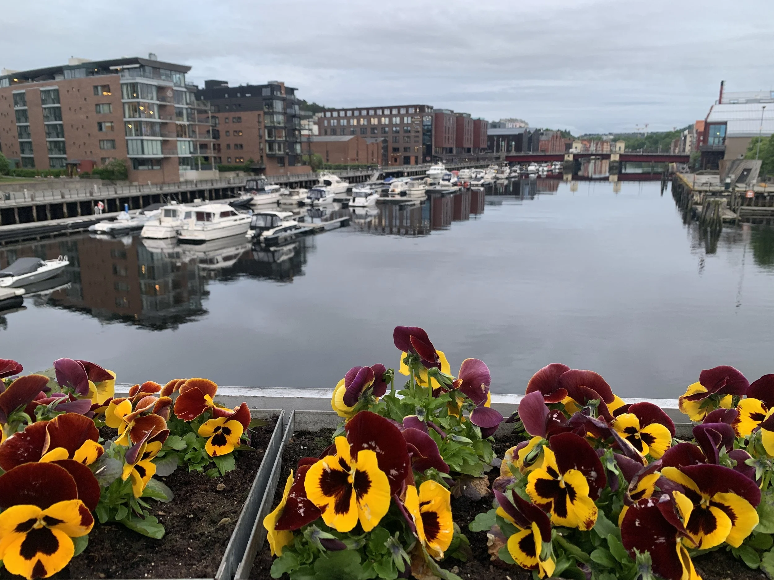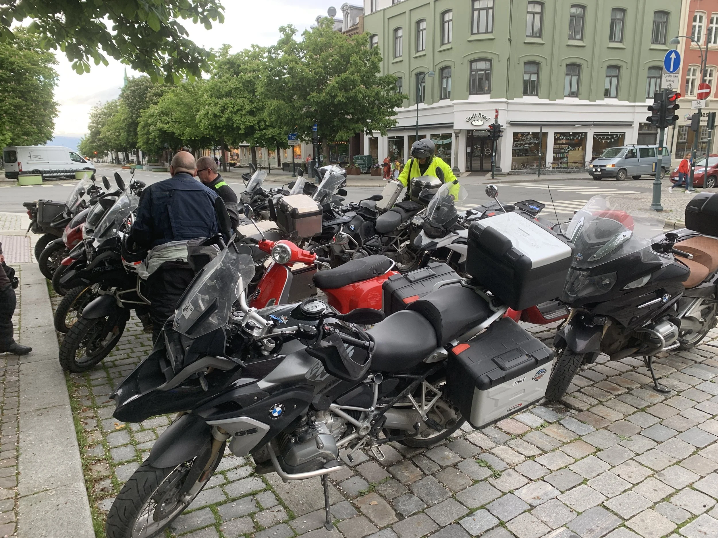 Pyörät laittettiin pysäköinintivalvonnan ystävällisellä opastuksella tila-tehokaasti maksuttomaan prätkäparkkiin hotellin kulmalle, kipaistiin suihkuun, syömään ja iltakävelylle vanhasta uudeksi rakennettuun telakka-alue -keskustaan. Ensin luultiin, että parkki-pirkot tulivat rahastamaan jättisaalistaan hotellin purkauskaistalla, mutta päin vastoin he tulivat neuvomaan miten pysäköinnin voi hoitaa maksuttomasti. Tästä taas pisteet norjalaisille