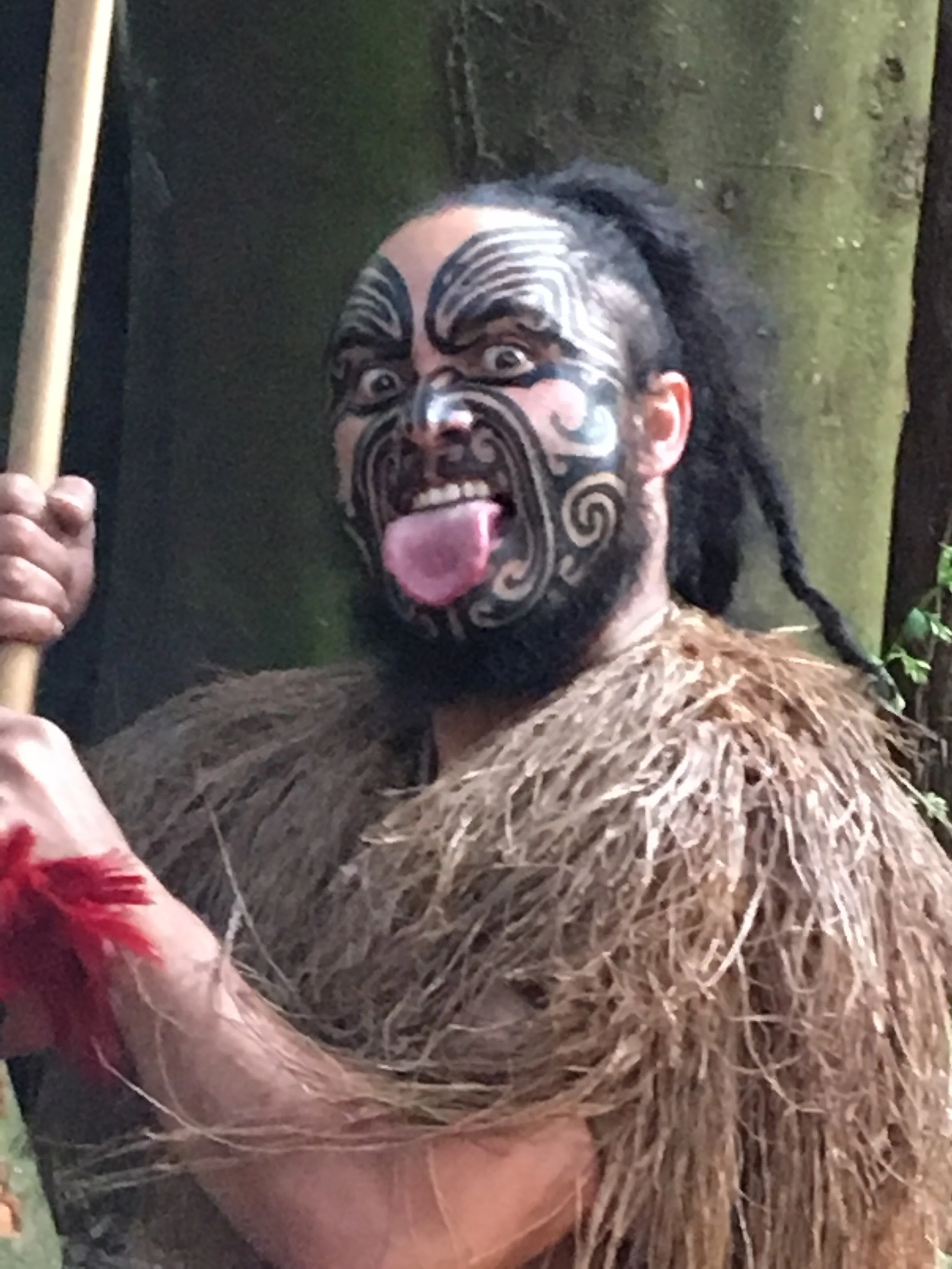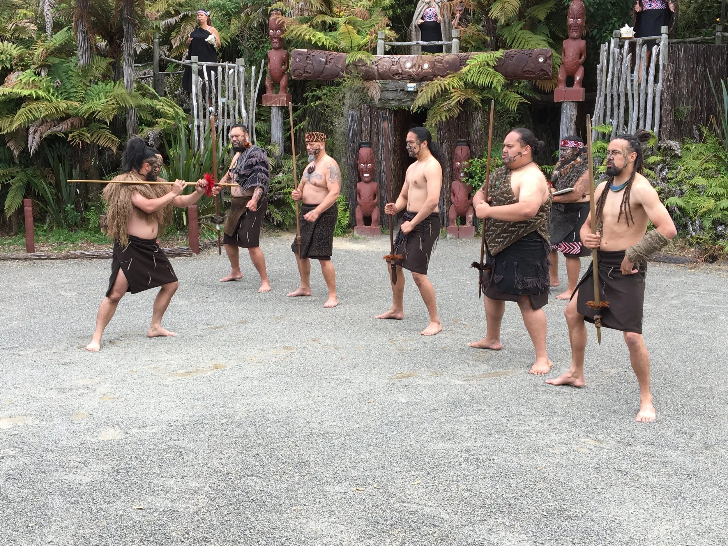 Kun Hobitittikylä oli nähty, suuntasimme Rotoruaan, jonne oli vain tunnin ajomatka. Ripeä "vaihda vaatteet lennossa -pukeutuminen" hotellilla ja sitten bussilla Maori kylään tutustumaan Maorien historiaan, perinteisiin ja nauttimaan päivän päätteeksi Maori illallista.