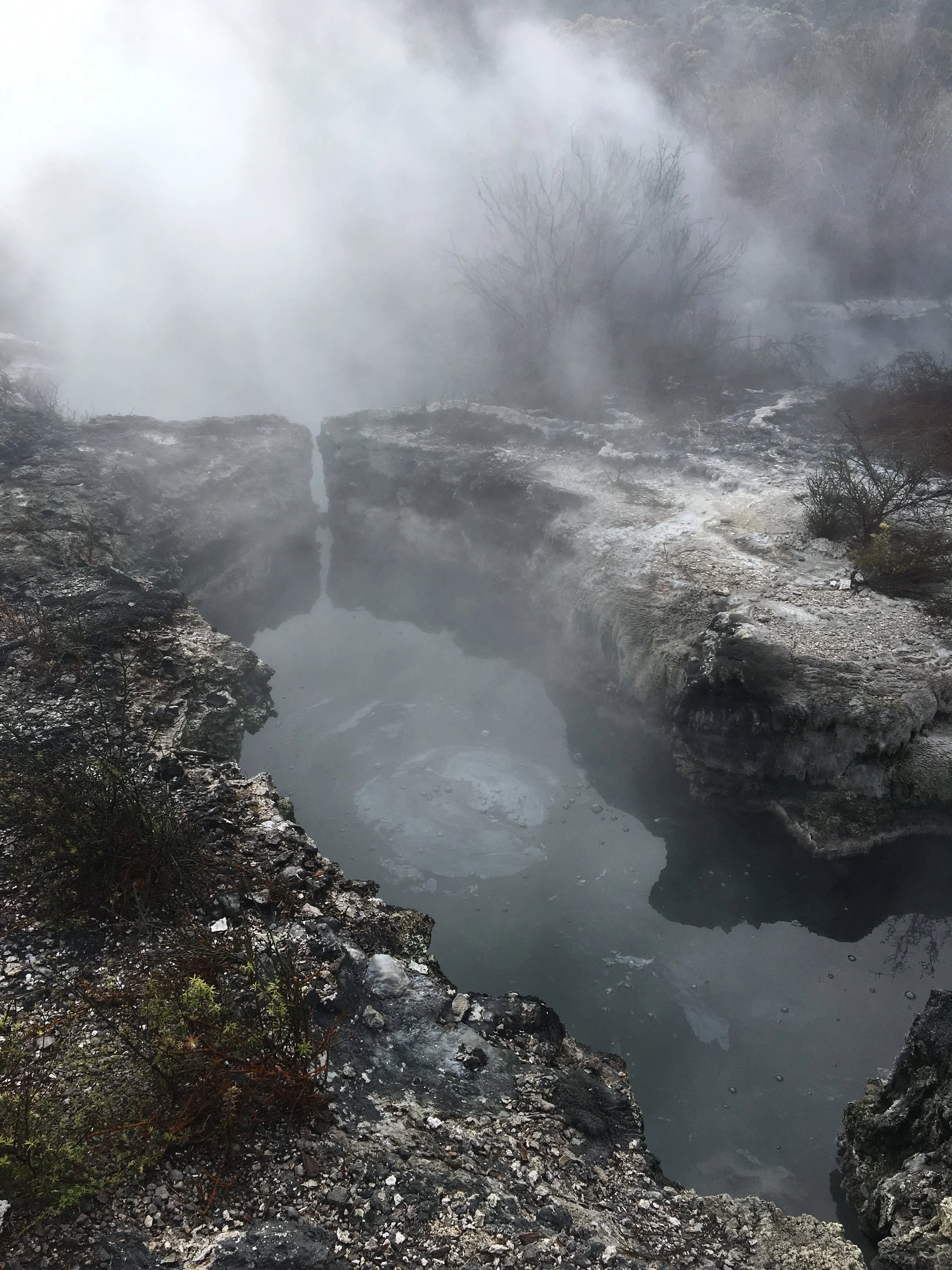 Sen raikkaammin ei ajopäivää voisi aloittaa. Kuplivaa vettä on siis muuallakin kuin laseissa... Whakarewarewa Villagen rikkipitoiset kuumat lähteet ja maaperästä nousevat höyryt eivät jätä epäilykselle sijaa, että tämä ei ole myöskään uimapaikka...